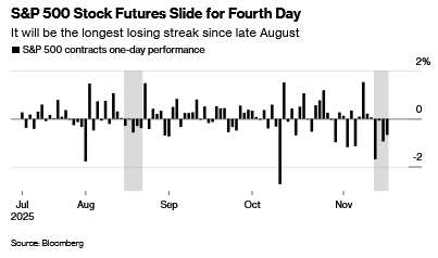 The S&P 500 was set for its longest losing streak since August, as a six-month rally shows signs of cracking following a $1.2 trillion selloff in cryptocurrencies and fears around stretched artificial intelligence valuations.