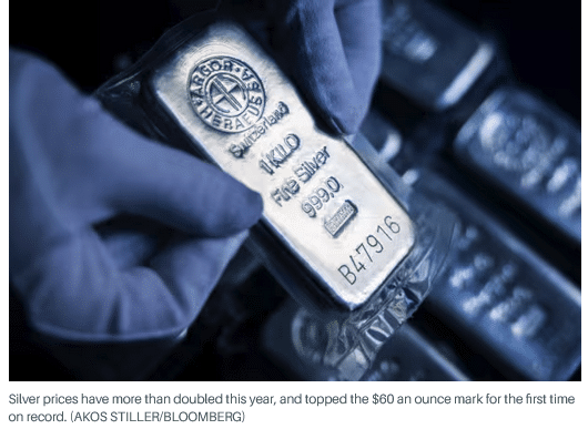 Silver prices +3.60% surged to a fresh all-time high on Wednesday, topping the $60 an ounce mark for the first time on record, as investors continue to seek inflation hedges and industrial alternatives to goldGC00+1.02% and digital currencies.