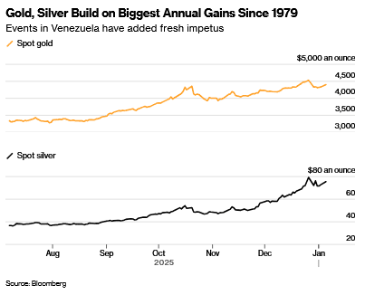 Spot gold rose as much as 2.5% on Monday, climbing above $4,430 an ounce, while silver gained almost 5%. President Donald Trump said the US plans to “run” Venezuela after ousting Maduro over the weekend, leaving the future governance of the South American nation uncertain. He said Washington required “total access” to the country, including its oil reserves.
