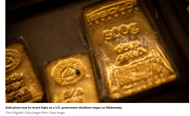 Gold prices soared to new highs on Wednesday, as the U.S. government entered its first shutdown in almost seven years after lawmakers failed to reach a deal on government funding.