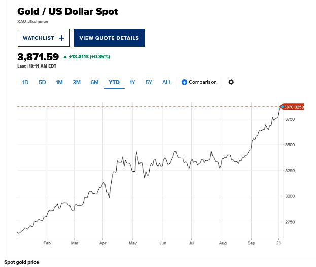 Spot gold hit a record of $3,894.63 an ounce, while U.S. gold futures for December delivery extended gains to hit a high of $3,922.70.