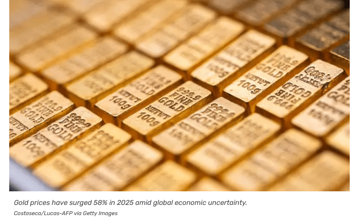 The yellow metal has surged 58% in 2025, trouncing the S&P 500, which is up just 13% year-to-date. Not even the AI-driven and technology-heavy Nasdaq has kept pace. It’s up 17%—solid, but nowhere near gold’s eye-popping return.