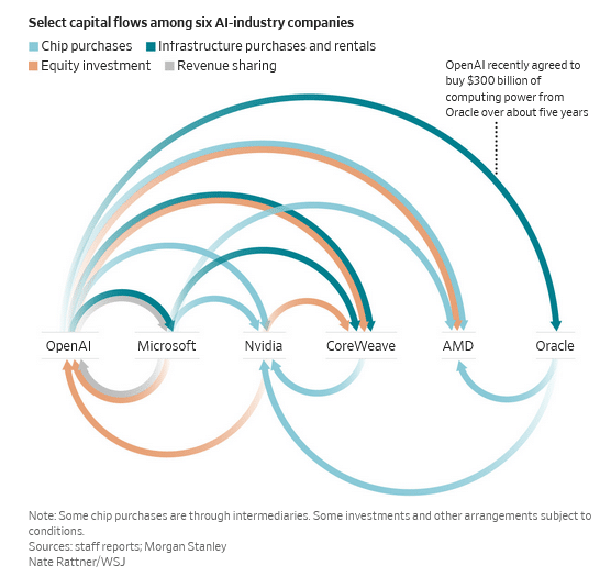 That is a relatively simple example. When Morgan Stanley analysts in an Oct. 8 report mapped out the AI ecosystem to show the capital flows between six companies—OpenAI, Nvidia, Microsoft, Oracle ORCL -0.95%decrease; red down pointing triangle, Advanced Micro Devices AMD -2.93%decrease; red down pointing triangle and CoreWeave CRWV -6.36%decrease; red down pointing triangle—the arrows connecting them resembled a plate of spaghetti.