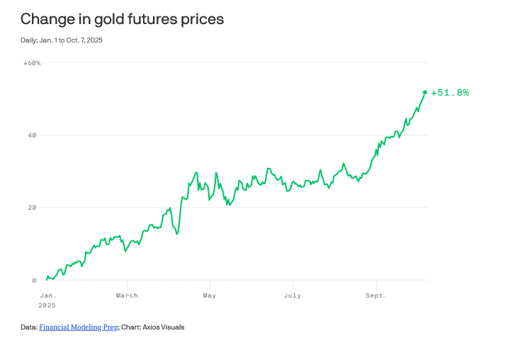 Driving the news: Gold futures on Tuesday topped a record high of over $4,000 an ounce for the first time, putting the precious metal on track for its best year since 1979 — a year of double-digit inflation, a Mideast oil crisis and the Soviet invasion of Afghanistan. So far this year, the price of gold is up 51%.