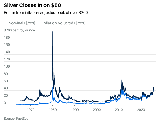 Most active silver settled at a record high of $48.994 on Wednesday after officially exceeding $49 during intraday trading, a level last surpassed 14 years ago. The price of silver is paltry when compared with gold’s price of $4,070.50, but the white metal has risen by 67.55% this year so far, or 13.42% more than gold’s 54.13% gain.